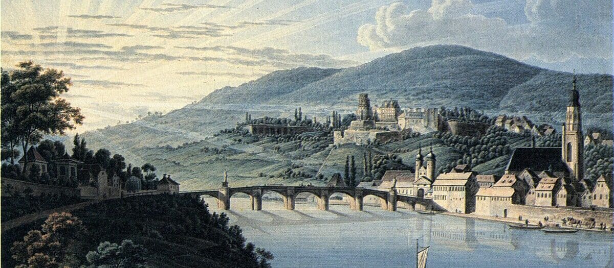 « Nous arrivâmes à Heidelberg vers midi. La ville me plut énormément. Comme situation on ne saurait rien imaginer de plus beau. Des deux côtés et en arrière de la ville se dressent des montagnes abruptes et boisées, où s’élève le vieux et vénérable château. J’y suis monté […]. Le nouveau pont est aussi une curiosité [2] ».