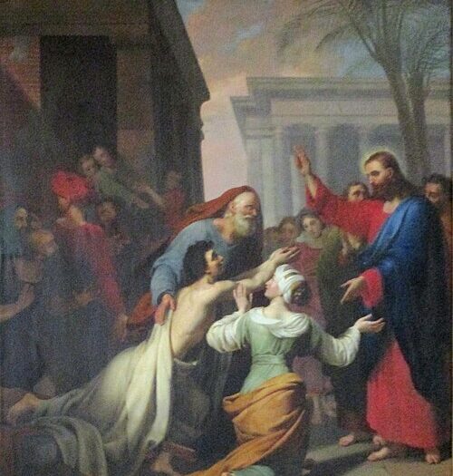 Autant la mère pâtit, autant Jésus compâtit efficacement. Tout son être est engagé. Ses sens, précisément sa vue : tout commence par le regard. Plus encore, son affectivité : le regard déclenche une réaction affective de compassion. En outre, cette réaction sentimentale est radicale [3]. Le terme utilisé, splangnizomai, que Luc évite habituellement, signifie « remuer aux entrailles » (le sens actif est : « manger les entrailles d’une victime » ou « les inspecter ») ; il l’emploie ici et dans la parabole du bon Samaritain (cf. Lc 10,33) et celle de l’enfant prodigue (cf. Lc 15,20) ; or, ce sont deux passages clés du récit lucanien ; il nous est donc signifié que cette guérison est aussi cruciale. Ensuite, cette affectivité est effective, efficace. Elle passe par une première médiation, non verbale, le contact avec la civière ; or, ce toucher signifie l’énergie divine transmise (cf. Lc 5,17 ; 6,19 ; 8,46 ; Ac 19,11-12) à la personne du fils avec compassion : que l’intention soit aimante élimine la trace de toute-puissance désordonnée qu’implique la magie. Elle passe aussi par la médiation langagière qui est solennelle – « jeune homme, je te le dis » (certains manuscrits vont jusqu’à redoubler le vocatif) – et efficace – « réveille-toi » (égéiro signifie aussi « lever », mais le sens ne convient pas ici).